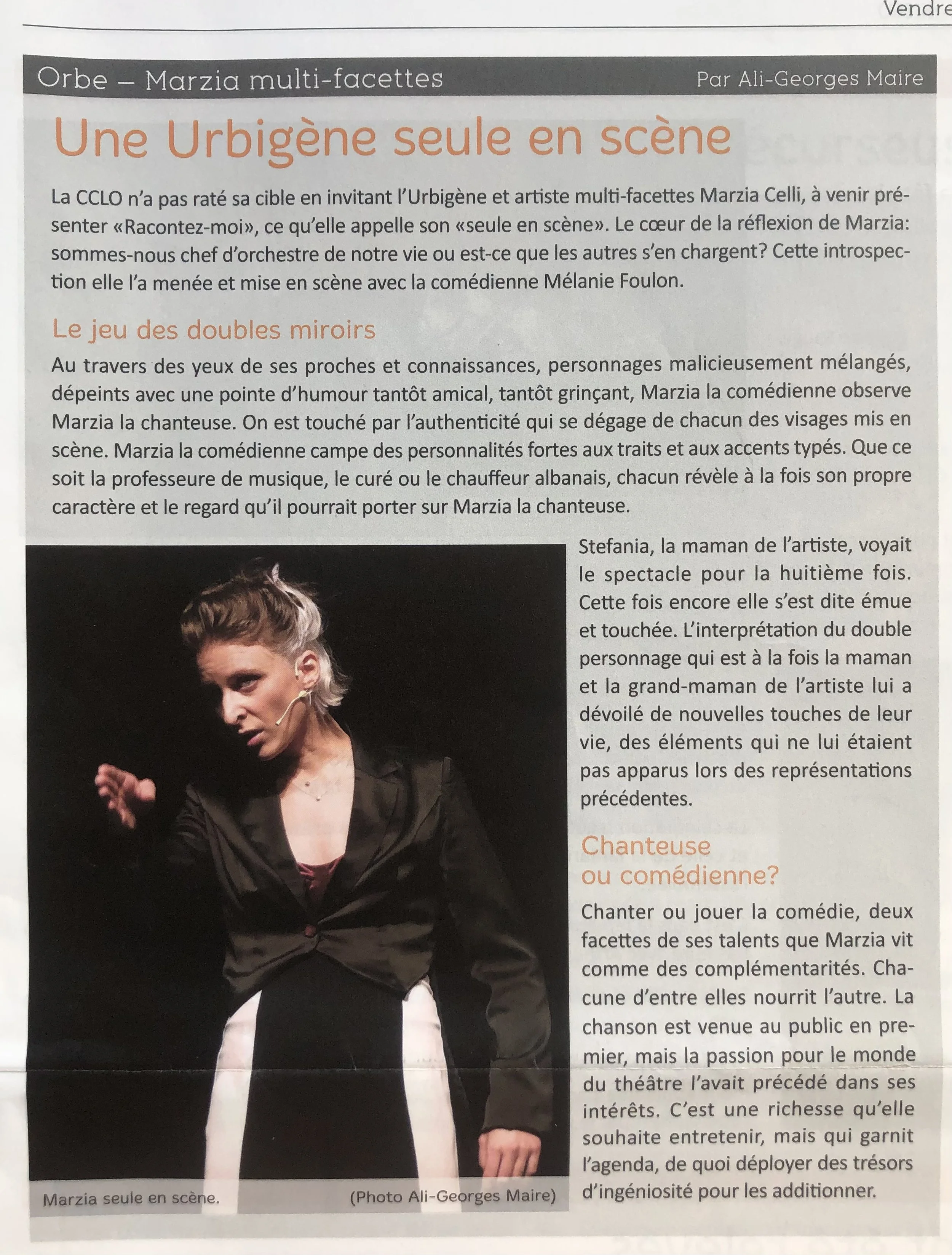 « …personnages malicieusement mélangés, dépeints avec une pointe d’humour tantôt amical, tantôt grinçant, Marzia la comédienne observe Marzia la chanteuse. On est touché par l’authenticité qui se dégage de chacun des visages mis en scène. »